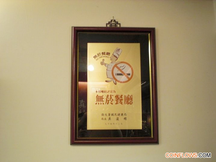 國民健康局頒發的無煙餐廳牌匾,