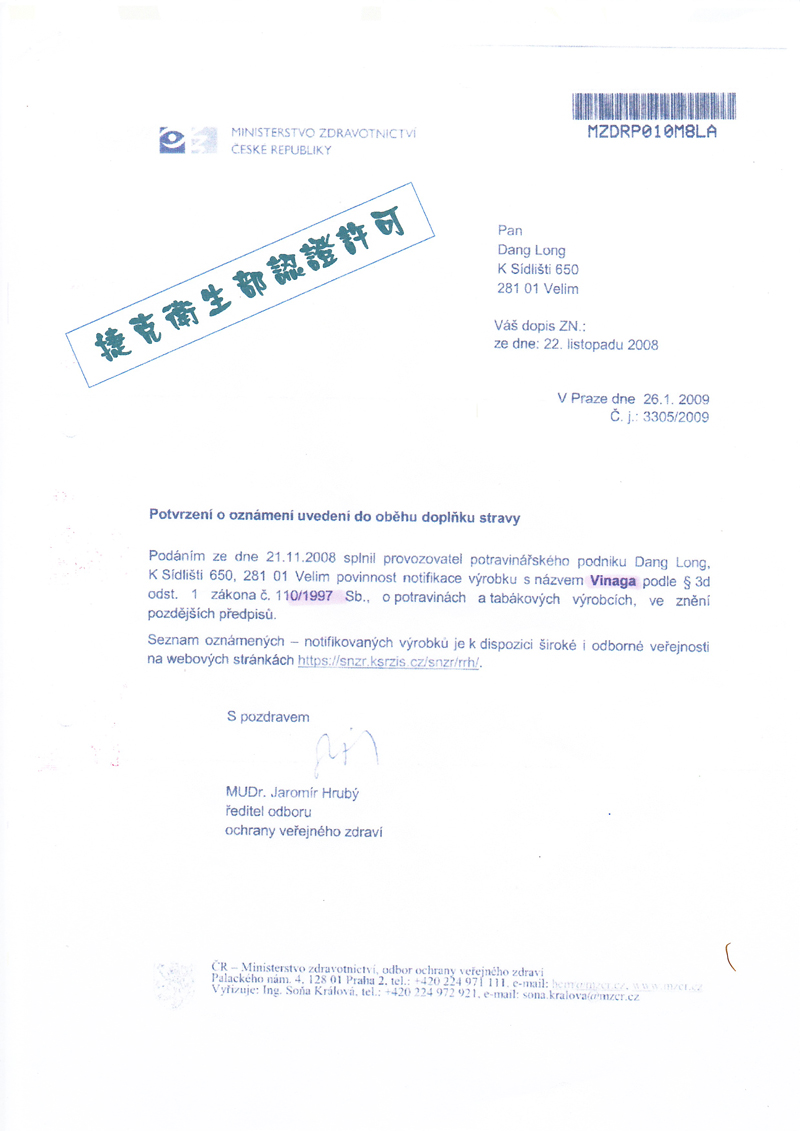 捷克衛生部認證